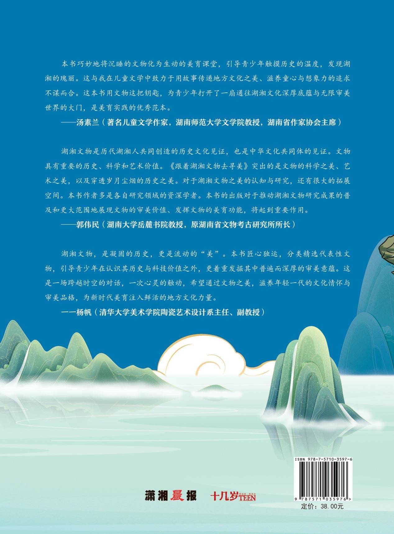 《跟着湖湘文物去寻美》(第一册)可谓名副其实的“大家小书”,由湖南大学岳麓书院副院长、教授、博士生导师陈仁仁,湖南师范大学历史文化学院教授李建毛,湖南博物院二级研究馆员、马王堆汉墓及藏品研究展示中心主任、中央电视台《开讲啦》栏目主讲嘉宾喻燕姣,湖南博物院研究馆员、享受国务院政府特殊津贴专家聂菲,湖南博物院研究馆员、马王堆汉墓及藏品研究展示中心副主任陈锐,湖南博物院馆员、北京大学考古文博学院文物与博物馆硕士郭三娟等五位专家学者组成创作团队,他们以深入浅出的方式,专为10至16岁青少年读者写下这本书。